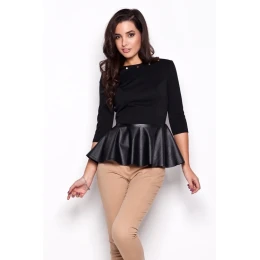 Originálna dámska blúzka K073 KATRUS s 3/4 rukávmi svojím strihom zdôrazňuje ženské krivky a pas. Okrúhly výstrih je ozvláštnený zdobením. Spodná časť - volánik - je vyrobený z imitácie kože.