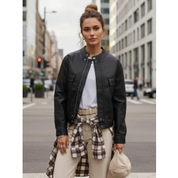Dámska bunda klasického krátkeho strihu z ekokože. Jednoduchý tvar bol doplnený funkčnými detailmi, ktoré dodávajú celkovému vzhľadu moderný a štruktúrovaný charakter. Model kombinuje voľnosť nosenia s jasne vymedzenou líniou, vďaka čomu je vhodný na každodenný styling. Dizajn zodpovedá potrebám prechodného obdobia.