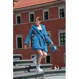 Bunda má voľný strih, dve vrecká a zapína sa knolíky. Model má dĺžku k bokom a v páse sa zaväzuje opaskom.