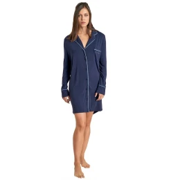 Dámska nočná košeľa španielskej značky Muydemi. Košeľa je košeľového strihu, okolo krku je golier, ktorý má okrúhle klopy. Nočná košeľa je celozapínacia. Vpredu je našité vrecko na ktoré je vytlačený nápis. Rukávy sú do jednoduché manžety. Dĺžka košele je nad kolená. Spodná časť košele je ľahko do guľata. Vnútorná časť košele je mierne počesaná chĺpkom.