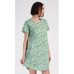 Dámska bavlnená nočná košeľa s krátkym rukávom Hawaii. Táto dámska nočná košeľa s okrúhlym výstrihom má pohodlnú dĺžku nad kolená. Nočná košeľa s krátkym rukávom je potlačená palmami a exotickými kvetmi v zeleno-bielej kombinácii. Použitý bavlnený materiál je mäkký a hebký na dotyk.