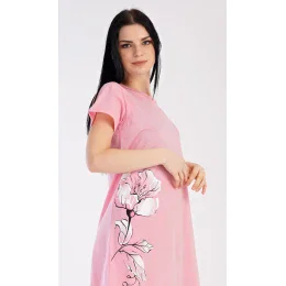 Dámska nočná košeľa Nicolette s krátkym rukávom. Nočná košeľa s okrúhlym výstrihom má v dolnej časti boku obrázok kvetu. Použitý materiál je príjemný a pružný na dotyk. Obsah bavlny je 100 % v lososovej farbe a 70 % v svetlosivej farbe.