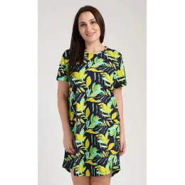 Dámska bavlnená nočná košeľa s krátkymi rukávmi Paulina. Táto dámska nočná košeľa s okrúhlym výstrihom má príjemnú dĺžku nad kolená. Tmavomodré tričko s krátkymi rukávmi je potlačené vetvičkami a listami v kontrastnej žltej a zelenej farbe. Použitý bavlnený materiál je príjemný a pružný na dotyk.