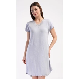 Dámska zimná nočná košeľa s krátkymi rukávmi. Pohodlná nočná košeľa s dĺžkou po kolená má na rukávoch a spodnom okraji riasenie a výstrih zdobí čipka. Na látke košele sú vytlačené malé bodky. Viskózový materiál s lycrou je príjemný a pružný na dotyk.