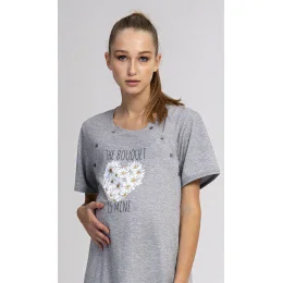 Dámska tehotenská nočná košeľa Sedmokráskové srdce. Strih tejto nočnej košele je vhodný na tehotenstvo, materstvo a dojčenie. Výstrihy na bokoch košele sa zapínajú na gombíky na dojčenie. Na hrudi inak jednofarebnej nočnej košele je sedmokráskové srdce s nápisom "Bouguet je môj". 70 % bavlnený materiál je mäkký a hebký na dotyk.