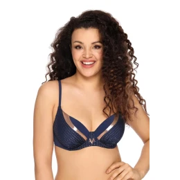 Podprsenka je vyrobená z veľmi kvalitnej tkaniny, ktorá dokonale zahaľuje a zvýrazňuje oblé tvary ženského tela. Lesklá potlač s medeným pruhom na atramentovo tmavo modrom pozadí uspokojí očakávania aj najnáročnejších zákazníčok. Vďaka vystuženiu podprsenka ideálne sťahuje poprsie k stredu hrudníka, nadnáša ho, poskytuje mu oporu a udržuje ho na správnom a žiaducom mieste.