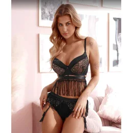 Košíčky v telovej farbe sú pokryté čipkou a čiernym mikrovláknom a majú vytvarované gélové vypchávky. Ramienka je možné nastaviť, ale nemožno ich odopnúť. V mieste spojenia košíčkov je mašlička s lesklou ozdobou. V spodnej časti modelu je páska so strapcami, ktorú je možné odopnúť.
