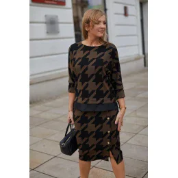 Táto dvojdielna dámska súprava si získala srdcia našich zákazníkov. Top je celý vyrobený z mäkkého žakárového úpletu a má tvar kimona so širšími ohrnutými rukávmi. Mierne vypasovaná sukňa so zlatými gombíkmi dodáva módny nádych. Vďaka širokej gume všitej do pása sa sukňa dokonale prispôsobí postave majiteľky. Blúzka je zdobená koženým lemom. Ozdobné kovové zátky v spodnej časti blúzky tiež zvyšujú jej atraktívnosť. Tento sofistikovaný strih poskytuje pohodlie ženám všetkých veľkostí. Bez podšívky.