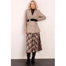 Modelka má na sebe veľkosť S. Rozmery modelky: výška 175 cm, prsia 89 cm, pás 64 cm, boky 92 cm.