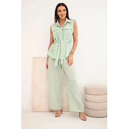 Táto štýlová dámska súprava je vynikajúcou ponukou pre ženy, ktoré oceňujú pohodlie, módny vzhľad a všestranné riešenia pri každodennom stylingu. Model pozostáva z blúzky bez rukávov so zapínaním na gombíky a dlhých nohavíc so širokými nohavicami, vďaka čomu je celý vzhľad ľahký, ženský a veľmi moderný. Ďalším plusom blúzky je klasický golier, náprsné vrecká a pás, ktorý krásne zvýrazňuje postavu. Nohavice majú pohodlný elastický pás, ktorý zaručuje komfort nosenia a dobré prispôsobenie sa postave.
