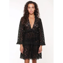 Dámska tunika značky Lingadore. Tunika má 7/8 rukáv, ktorý je ukončený strapcami. Strapce sú našité v kaskádach po obvode tuniky. Tunika je voľná, celokrajková, vhodná na plavky na pláž alebo k bazénu. Má veľký výstrih do "V", na ktorom sú našité šnúrky so strapcami pre stiahnutie medzi prsiami. Tunika je dlhšia nad kolená, spodný okraj zdobia malé brmbolce.