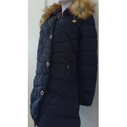 Dámsky zimný dlhý kabát, prešívaný, s kapucňou a odnímateľnou kožušinou.
