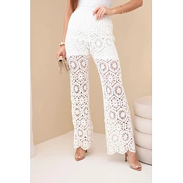 Štýlové dámske nohavice s čipkovým úpletom sú výnimočnou voľbou pre ženy, ktoré si cenia originálny dizajn a pohodlie. Model vyniká efektným ozdobným vzorom, ktorý celku dodáva ľahký a módny nádych. Priehľadná štruktúra materiálu zaručuje, že nohavice sa dokonale hodia k letným outfitom, najmä v boho a ležérnom štýle.