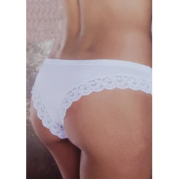 Dámske nohavičky brazilkového strihu značky Cotonella. Nohavičky sú kombináciou hladkej látky a kvetinové čipky po obvode nohavičiek. V hornom obvode je vsadená aplikácie s logom Cotonella. Do vnútorného dielu je zapracovaný bavlnený klin z BIO bavlny pre komfortné nosenie.