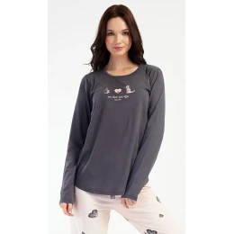 Dámske bavlnené dlhé pyžamo Cat. Pyžamo sa skladá z trička s dlhým rukávom a dlhých nohavíc. Tričko je jednofarebné, zdobené obrázkom šálky na kávu, mačky a srdca. Potlač srdca sa opakuje na nohaviciach, ktoré majú elastický pás a šnúrku na stiahnutie, ale nemajú vrecká. Použitý bavlnený materiál je pružný a príjemný na dotyk.
