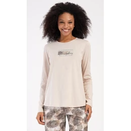 Dámske bavlnené dlhé pyžamo Everyday. Pyžamo sa skladá z trička s dlhým rukávom a dlhých nohavíc. Tričko je jednofarebné, zdobené obrázkom vetvičiek a nápisom Everyday. Motív vetvičiek sa opakuje na nohaviciach, ktoré majú elastický pás a šnúrku na stiahnutie, ale nemajú vrecká. Použitý bavlnený materiál je pružný a príjemný na dotyk.