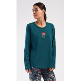 Dámske bavlnené dlhé pyžamo Jasmine. Pyžamo sa skladá z trička s dlhým rukávom a dlhých nohavíc. Tričko je jednofarebné, zdobené obrázkom orientálneho kvetu. Tento motív sa opakuje na nohaviciach, ktoré majú elastický pás a šnúrku na stiahnutie, ale nemajú vrecká. Použitý bavlnený materiál je pružný a príjemný na dotyk.