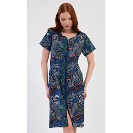 Dámske bavlnené šaty s krátkymi rukávmi Barbara. Pohodlné šaty bez zapínania v príjemnej dĺžke pod kolená sa dajú použiť takmer na všetky voľnočasové aktivity. Majú praktické vrecká a zapínanie na zips. Tmavomodré šaty sú potlačené farebnými vetvičkami. Použitý bavlnený materiál je príjemný a pružný na dotyk.