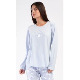 Dámske bavlnené dlhé pyžamo Nature lover. Pyžamo sa skladá z trička s dlhým rukávom a dlhých nohavíc. Tričko je jednofarebné, zdobené kvetinovým motívom. Kvetinová potlač sa opakuje aj na nohaviciach, ktoré majú elastický pás a šnúrku na stiahnutie, ale nemajú vrecká. Použitý bavlnený materiál je pružný a príjemný na dotyk.