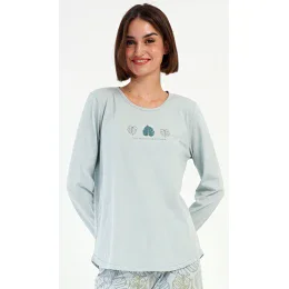 Dámske bavlnené dlhé pyžamo Sofie. Pyžamo sa skladá z trička s dlhým rukávom a dlhých nohavíc. Tričko je jednofarebné, zdobené obrázkom listov a malým nápisom. Motív listov sa opakuje na nohaviciach, ktoré majú elastický pás a šnúrku na stiahnutie, ale nemajú vrecká. Použitý bavlnený materiál je pružný a príjemný na dotyk.