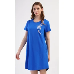 Dámske bavlnené domáce šaty s krátkym rukávom Flowers. Domáce šaty sú jednofarebné, majú okrúhly výstrih a vrecká zdobené kvetinovým motívom a nápisom "Amour" na hrudi. Použitý bavlnený materiál je príjemný a pružný na dotyk. Šaty sú pohodlné, vhodné na spanie aj na každodenné nosenie.