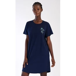 Dámske bavlnené domáce šaty s krátkym rukávom Zuzka. Domáce šaty jednofarebné s okrúhlym výstrihom a vreckami zdobí obrázok kvetov na hrudi.