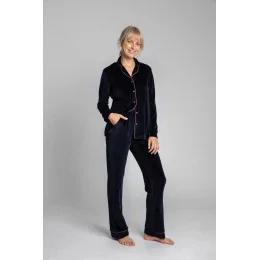 Spite, ale štýlovo v týchto zamatových nohaviciach s manžetami a ozdobným lemovaním, ktoré majú siluetu inšpirovanú pánskou módou. Vytvorte si súpravu s našou zamatovou pyžamovou košeľou s ozdobným lemovaním.