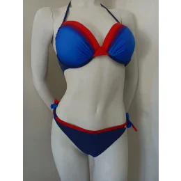 Dámske dvojdielne plavky, vrchný diel vystužený, s kosticami, na zaväzovanie za krkom a na chrbte. Spodný diel na zaväzovanie na bokoch.