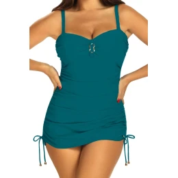 Dámske dvojdielne plavky Bayamon 15 8050BM 7 SELF - tyrkysová farba - typ tankiny - vyrobené z kvalitného mikrovlákna - vystužené košíčky bez kostice - zdobenie medzi košíčkami - odopínateľné a nastaviteľné ramienka - nariasené boky so šnúrkami - nohavičky so širokými bokmi - rýchloschnúci materiál, odolný voči chlóru a slnku