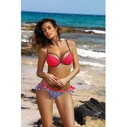Výnimočné plavky s hladkou podprsenkou, ramienkami (gumičkami) vo výstrihu a vzorovanými nohavičkami, so strihom najmódnejších "brazilky" tejto sezóny. Hot! Horúca novinka! Plavky sa dodávajú v dvoch krásnych farbách - pastelovo ružovej a nektárinkovej. Podprsenka je vystužená jemnou penou, v spodnej časti má kostice a sexy push-up vypchávky, vďaka ktorým získate mimoriadne zmyselný dekolt a samotné prsia budú výrazne bližšie k sebe, nadvihnuté a opticky zväčšené. Konštrukcia navrhnutá pre malé a stredné poprsie vyzerá veľmi atraktívne. Výstrih s módnymi pruhmi je sladkým lákadlom pre mužské pohľady. Nastaviteľné popruhy, pohodlné zapínanie na pracku. Vzorované nohavičky s kontrastným lemovaním, ktoré ďalej prechádzajú v koketné viazačky na oboch stranách bokov. Brazílsky strih, ktorý je v tejto sezóne najmódnejší. Aby ste dosiahli plný brazílsky efekt, vyhrňte nohavičky výrazne hore, aby ich sexy tvar zvodne zdobil zadoček.