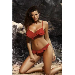 Tento outfit vám dodá výnimočný šarm (a dá vám zabudnúť na všetky vaše komplexy). Má skvelý strih. Bol vytvorený pre malé a stredne veľké prsia - dobre zbiera, tvaruje a zdvíha prsia a výrazne ich zväčšuje. Dekolt získa pôvab, sexappeal a maximálnu ženskosť. Jeho tajomstvo? - sú košíčky vystužené mäkkou penou, s kosticami a pomerne veľkou push-up výplňou, ktorá je tentoraz trvalo umiestnená vo vnútri podprsenky. Volánový výstrih je jedným z hlavných trendov tohto leta. Nastaviteľné ramienka, zaväzovanie na chrbte. Ku koketným nohavičkám rumpálového strihu, tiež s volánom. Plavky boli vyrobené z krásnych talianskych tkanín Carvico a sú k dispozícii v rôznych atraktívnych plážových farbách. Vyberte si ho podľa svojho vkusu!
