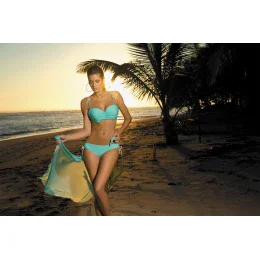 Ženské a koketné dvojdielne plavky s osvedčeným a nenahraditeľným vzorom bardotka. Podprsenka typu balconette dokonale nadvihne a podoprie aj veľké prsia. Prsia sú dokonale vytvarované. Správny strih umožňuje rovnomerné opálenie.