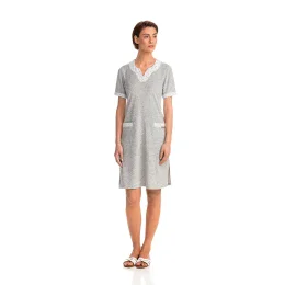 Pohodlné jednofarebné froté šaty s výstrihom do V a krátkymi rukávmi. Šaty sú vyrobené z froté bavlny so zmesou polyesteru. Froté bavlna je vysoko savá, rýchlo schne, je dobre priedušná, príjemná a mäkká na dotyk. Zmes polyesteru zaručuje vyššiu odolnosť a dlhšiu životnosť materiálu, je ľahšia a nemačká sa.