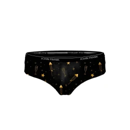 Dámske hipster nohavičky od značky John Frank vyrobené z vysokého podielu bavlny. Nohavičky s módnou potlačou sú veľmi príjemné na dotyk a pohodlné na nosenie. Jemný, stredne široký elastický pás má okolo seba logo John Frank. Do vnútornej časti je zakomponovaný bavlnený klin pre pohodlné nosenie.