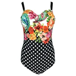 Dámske jednodielne plavky s potlačou kvetov a bodiek. Košíčky vystužené s podpornou gumou, bez kostíc. Posúvacie ramienka, vpredu odopínacie.