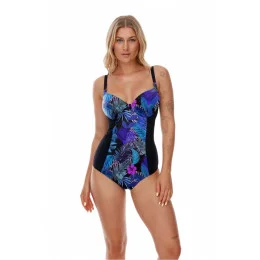 Jednodielne plavky vytvorené pre ženy s plnšími tvarmi, ideálne na pláž aj do bazéna. Strih plaviek kombinuje funkčnosť a eleganciu. Plavky majú všitú podprsenku s mäkkými košíčkami s kosticami a nastaviteľnými neodnímateľnými ramienkami. Šírka a typ ramienok sú prispôsobené veľkosti plaviek. Čierne látkové vsadky na bokoch opticky zoštíhľujú a tvarujú siluetu. Kvetinový pletený motív v modrých odtieňoch pripomína rajské pláže, ktoré sú spájané s bezstarostnou letnou dovolenkou. Zadný diel plaviek sa zapína na pracku.