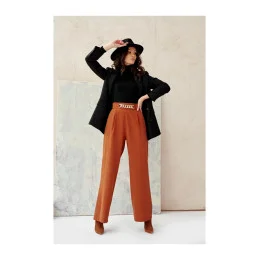 Dámske nohavice so širokými nohavicami a ozdobnými retiazkovými detailmi sú vyrobené z kvalitnej tkaniny, ktorá dýcha a zaisťuje pohodlné nosenie. Nohavice majú široké nohavice zvonového strihu. Majú tiež vysoký náplet pre štíhlejšiu siluetu a ozdobný retiazkový opasok. Zapínajú sa vzadu na zips. Výrobok je vyrobený a ušitý v Poľsku.