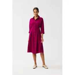 PODROBNOSTI O PRODUKTE: šaty z tkanej látky s golierom na gombíky rozšírený dizajn s podšívkou v páse 3/4 rukávy s manžetami dĺžka pod kolená bez podšívky Naša modelka je vysoká 174 cm a nosí veľkosť S navrhnuté a vyrobené v Poľsku