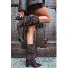 Dámské kozačky vyrobené z měkké ekologické semiše. Model na stabilním podpatku typu sloupek a s úzkými špičkami krásně zeštíhluje nohy a dodává siluetě lehkost. Naskládaná výška a ozdobné třásně dodávají celku jedinečný, stylový charakter. Boty jsou zapínané na zip, což usnadňuje jejich obouvání. Vnitřek s teplým podšitím zajišťuje teplo a komfort v chladnějších dnech. Ideální volba pro ženy, které mají rády spojení pohodlí s trochou boho elegance — skvělé jak k kalhotám, tak ke šatům.