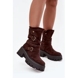 Dámské kotníkové boty na robustním podpatku s přezkami a páskem čokoládové Nerelisa