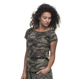 Dámske tričko z hladkého jednoduchého džersejového materiálu s potlačou maskáčového vzoru, dvojitými švami a pevným lemom. Hmotnosť: 170 g/m2.