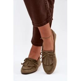 Ploché dámské mokasíny vyrobené z eko semiše jsou stylovou a pohodlnou volbou na každý den. Vepředu jsou dekorativní třásně a zavázání ve tvaru mašle. Měkký materiál zajišťuje pohodlí při nošení a plochá podrážka činí tento model ideálním pro každodenní použití. Mokasíny skvěle doplní jak klasické, tak i volnější stylizace. Při výběru velikosti se řiďte tabulkou velikostí.