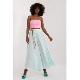 Viskózové nohavice s vysokým pásom a elastickým pásom. Nohavice so širokými nohavicami, ozdobný pásik na zaväzovanie.