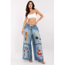 Štýlové palazzo nohavice ideálne na každý deň, vyrobené z ľahkého materiálu, ktorý poskytuje pohodlie a voľnosť pohybu. Tieto voľné nohavice majú farebnú potlač, ktorá im dodáva jedinečný charakter. Sú vyrobené z viskózy s prímesou polyesteru, sú priedušné a príjemné na dotyk. Majú vysoký pás, ktorý zvýrazňuje pás, a široké nohavice, ktoré dodávajú siluete ľahkosť a eleganciu. Šnúrky v páse umožňujú prispôsobenie a poskytujú dodatočné pohodlie. Sú ideálne na každý deň a dodajú štýl každému voľnému oblečeniu.
