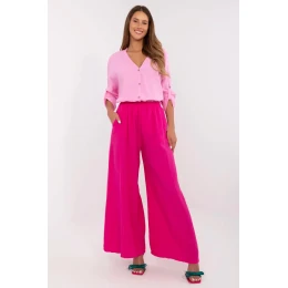 Tieto ľahké a štýlové dámske mušelínové nohavice sú ideálnou voľbou na teplé dni. Sú vyrobené z priedušnej bavlny a zaručujú pohodlie pri nosení a prirodzenú voľnosť pohybu. Palazzo strih so širokými nohavicami im dodáva elegantný a zároveň ležérny charakter, ktorý je ideálny na každý deň. Elastický pás zaručuje pohodlné nosenie, zvýrazňuje pás a zvyšuje pohodlie pri používaní. Bočné vrecká dodávajú nohaviciam praktickosť a vďaka hladkému vzoru sú univerzálne a ľahko sa štylizujú. Skvele sa hodia k priliehavému vrchu aj voľnejšiemu tričku, čím vytvárajú ľahké a moderné komplety na rôzne príležitosti.