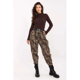 Dámske látkové nohavice v ležérnom štýle, ideálne na každý deň. Sú vyrobené zo zmesi viskózy, polyesteru a elastanu a spájajú v sebe pohodlie s pružnosťou a odolnosťou. Model s vysokým pásom, zúženými nohavicami a elastickým pásom zaručuje pohodlie pri nosení a zopnutý pás zvýrazňuje pás. Bočné vrecká a moderný vzor moro na celom materiáli dodávajú nohaviciam moderný, osobitý charakter.