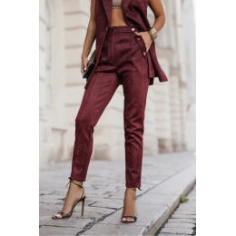 Nabízíme cygaretkové kalhoty KIARA v elegantní barvě bordó, které jsou ideálním doplňkem každého šatníku. Tyto stylové kalhoty jsou vyrobené z materiálů vysoké kvality, kombinující viskózu (95 %) a elastan (5 %), co zaručuje pohodlí a dokonalé přizpůsobení postavě. Cygaretkové kalhoty KIARA se vyznačují univerzálním střihem, který zdůrazňuje přednosti postavy. Jsou skvělou volbou jak pro každodenní stylizace, tak pro večerní výlety. Délka nohavice 90 cm je ideální pro nošení se štíhlými podpatky stejně jako s více ležérní obuví. Tyto kalhoty jsou skvělou volbou pro ženy, které oceňují klasický styl s nádechem moderního designu. Bordová barva dodává eleganci a umožňuje snadné sladění s mnoha dalšími barvami a vzory. Cygaretkové kalhoty KIARA jsou skutečnou investicí do vašeho šatníku. Díky použití elastických vláken se kalhoty ideálně přizpůsobí tělu a zajistí pohodlí při každém pohybu. Nemusíte se obávat o jej