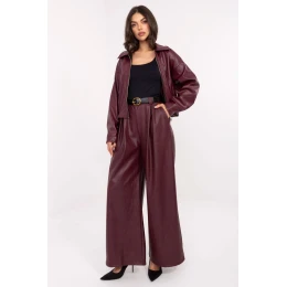 Elegantné a pohodlné palazzo nohavice vyrobené z vysokokvalitnej ekokože (zmes polyesteru a polyuretánu). Model so širokými nohavicami a vysokým pásom krásne zvýrazňuje pás a zároveň poskytuje voľnosť pohybu. V páse je vložený elastický pás, vďaka ktorému nohavice dokonale sedia. Okrem toho majú zapínací pás, ktorý zvýrazňuje postavu a dodáva celku elegantný akcent. Model má bočné vrecká a hladký materiál, ktorý mu dodáva moderný, minimalistický charakter. Je ideálnou voľbou na každodenné nosenie, ako aj do práce, pričom zaručuje pohodlie a štýlový vzhľad počas celého dňa.