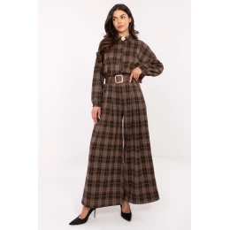 Moderné a pohodlné dámske flanelové nohavice typu palazzo s ležérnym charakterom, ktoré sú ideálne na každodenný styling. Sú vyrobené z kvalitnej zmesi polyesteru, viskózy a elastanu a ponúkajú pohodlie, ľahkosť a jemnú elasticitu, vďaka ktorej sa dokonale prispôsobia postave. Model má vysoký pás a široké nohavice typu palazzo, ktoré opticky predlžujú nohy a dodávajú postave ľahkosť. Bočné vrecká a zapínanie na opasok dodávajú nohaviciam praktickosť a umožňujú zvýrazniť pás. Nohavice majú károvaný vzor, ktorý prináša klasický, nadčasový akcent, a absencia zapínania zaručuje, že sú mimoriadne pohodlné a ľahko sa nosia. Ide o univerzálny model, ktorý je ideálny na každodenný, ležérny styling aj elegantnejšie pracovné komplety.