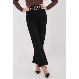 Tyto stylové kalhoty byly vytvořeny s ohledem na ženy, které si cení elegance spojené s pohodlím. Vyrobené z vysoce kvalitní směsi viskózy, nylonu a elastanu, zajišťují ideální přizpůsobení a pohodlí po celý den, bez ohledu na příležitost. Hladký, klasický materiál jim dodává nadčasový vzhled, a vysoký pas krásně zdůrazňuje pas a prodlužuje siluetu. Přímé nohavice typu straight leg dělají kalhoty elegantní a stylové, skvělé jak do práce, každodenních setkání, tak i na slavnostní příležitosti. Model se zapíná na skrytý zip, co podtrhuje uklizený dojem. Další výhodou je pásek zapínající se v pasu, který umožňuje ideální přizpůsobení a slouží jako jemný dekorativní prvek. Charakteristický lem na zadní straně nohavice dává kalhotám eleganci a podtrhuje jejich elegantní charakter. Univerzální, pohodlné a nadčasové, ideální pro každý outfit, kde se počítá styl a pohodlí.